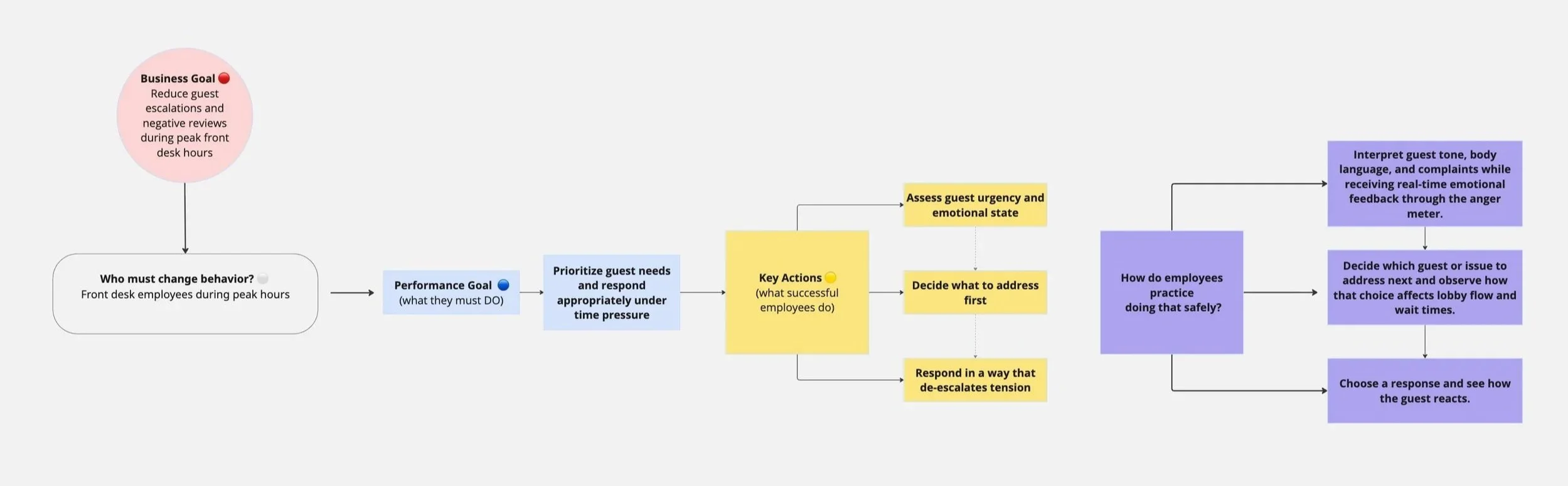 Rather than designing content around policies, I began by identifying the critical moments where front desk decisions most often lead to guest escalation. Using action mapping, I focused on what employees must do differently during peak hours such as prioritizing guest needs, choosing when to intervene, and deciding how to respond when emotions run high.